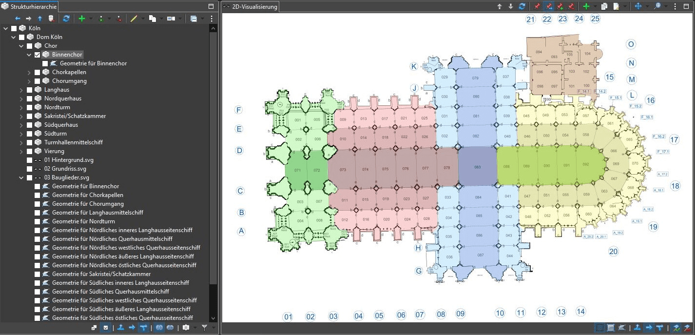 Die Verknüpfungen zwischen grafischen Elementen der SVG-Datei und Strukturelementen werden intern in MonArch als Geometrien bezeichnet. Standardmäßig kann jedes geschlossene Polygon innerhalb der Grafik als Geometrie ausgezeichnet und mit einem Bauteil, das es in der Grafik repräsentieren soll, verknüpft werden. Eine Ausweitung der klickbaren Bereiche auf auch nicht geschlossene, aber gefüllte oder alle Formen ist ebenfalls möglich. Der Detaillierungsgrad ist frei wählbar: Geometrien können entweder grob zur Orientierung oder sehr präzise zur Darstellung einzelner Bausteine verwendet werden. So steht beispielsweise die in Bild 1 grün markierte Fläche im Chorbereich des Grundrissplans für das Strukturelement „Binnenchor“. In der Strukturhierarchie befindet sich die entsprechend benannte Geometrie mit dem aussagekräftigen Namen „Geometrie für Binnenchor“ (wird automatisch gesetzt) sowohl unter dem 2D-Modell „03 Bauglieder.svg“ als auch unter dem Strukturelement des Binnenchors selbst. Das Setzen mehrerer solcher Verknüpfungen erzeugt die navigierbare Visualisierung: Ein Klick in die Grafik wählt automatisch das entsprechende Element in der Hierarchie an.