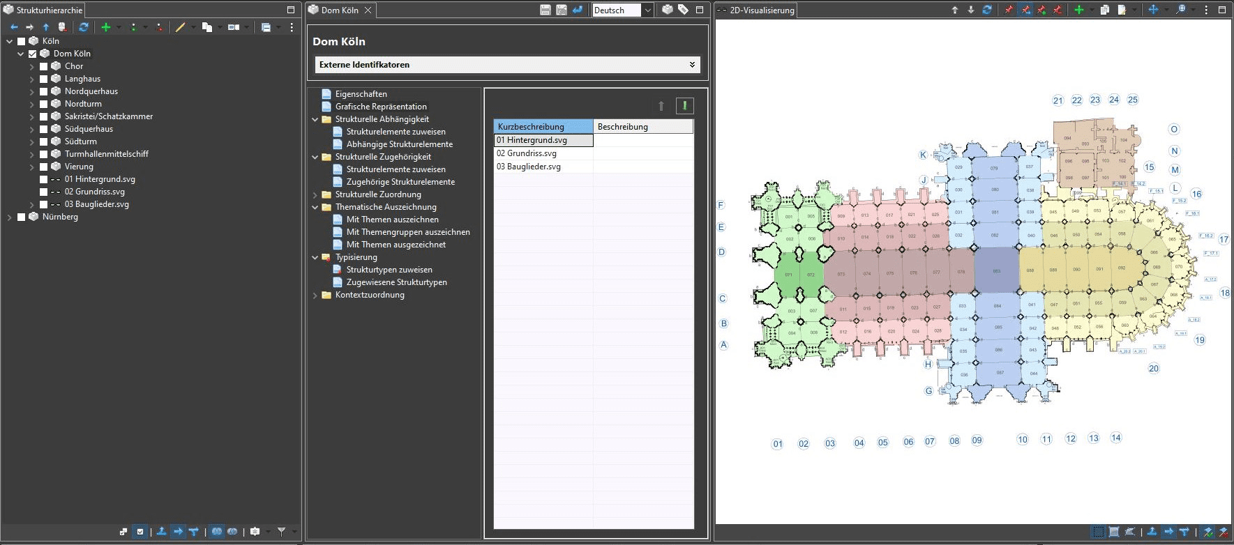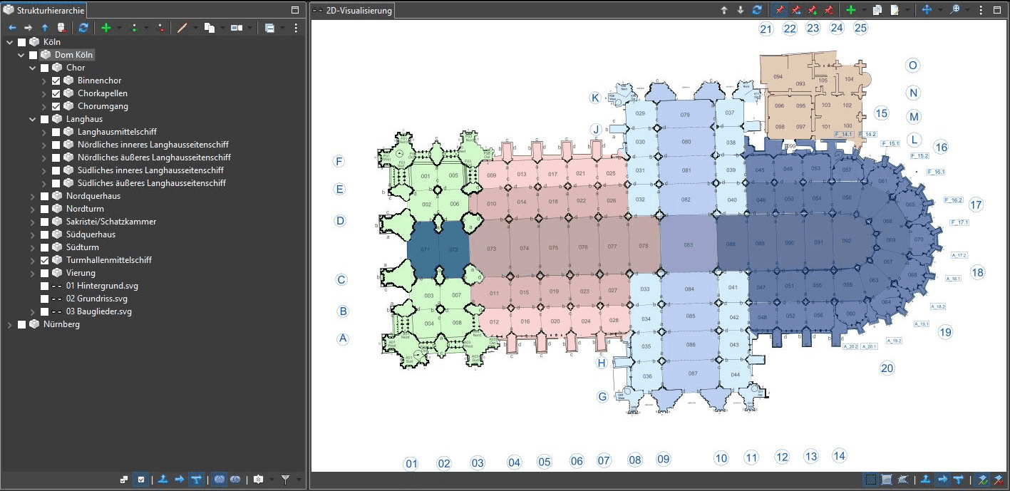 Wird anschließend der Kölner Dom in der Strukturhierarchie angewählt, werden alle drei Modelle gleichzeitig in das Visualisierungsfenster geladen. Die Reihenfolge des Renderings spielt dabei eine wichtige Rolle, da sich multiple Grafiken möglicherweise überlagern. In diesem Fall ist es entscheidend, erst den bunten Hintergrund zu zeichnen und erst darüber den eigentlichen Grundrissplan, damit er nicht von den bunten Flächen verdeckt wird. Zusätzlich muss die unsichtbare Navigationsebene an oberster Stelle liegen. Jeder Mausklick auf einen Bereich im Visualisierungsfenster liest das gerade ausgewählte Element aus der ursprünglichen Grafik aus und überprüft, ob es mit einem Strukturelement verknüpft wurde. Anschließend wir das gefundene Strukturelement in der Strukturhierarchie angewählt. Wird jedoch ein klickbares Element von einem anderen grafischen Element wie z.B. einem der bunten Felder überlagert, kann statt dem gewünschten Element nur das darüber liegende bunte Feld ausgelesen werden. Im Eigenschaftenfenster des jeweiligen Strukturelements, an dem die 2D-Modell angehängt wurden (hier also des Kölner Doms), kann die Zeichenreihenfolge der enthaltenen Modelle festgelegt werden. Die in der Tabelle an oberer Stelle aufgeführten Modelle werden zuerst gezeichnet und erscheinen somit im Hintergrund der Visualisierung (s. Bild 2).