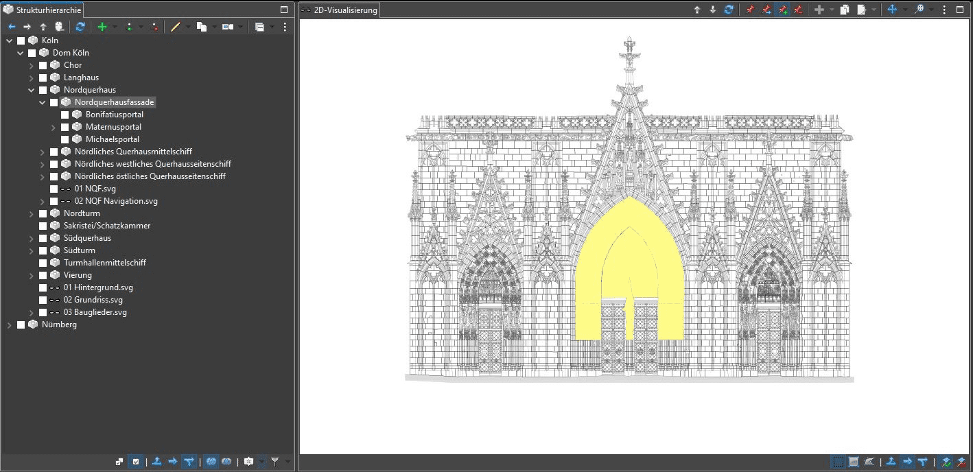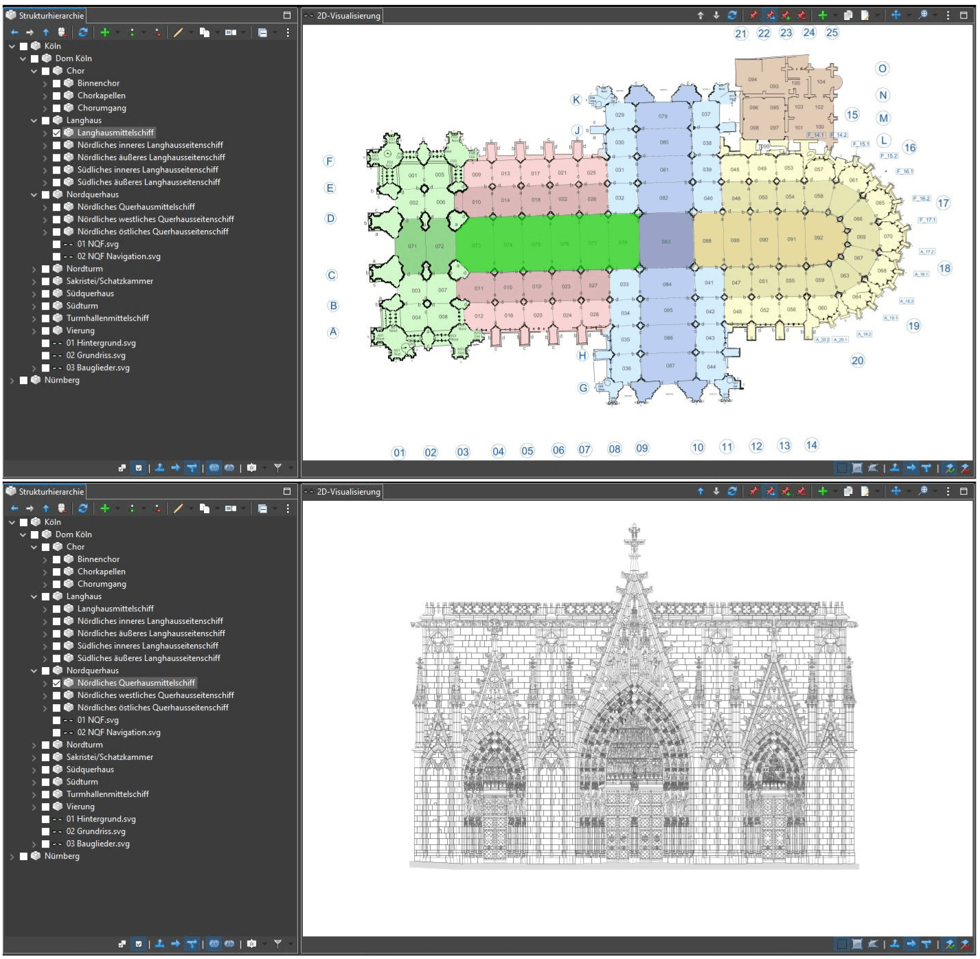 Der Navigationsmodus wird bei jedem Start MonArchs automatisch aktiviert und ist über den zweiten der Modi-Buttons (roter Stecknadelkopf mit blauem Pfeil) erreichbar. Hier kann im Gegensatz zum eingefrorenen Selektionsmodus durch den Datenstand navigiert werden. Ein Klick auf einen Bereich der 2D-Grafik aktiviert das verknüpfte Strukturelement, ebenso bewirkt das An- oder Abwählen eines Elements in der Hierarchie die entsprechende Einfärbung in der Grafik. Wird ein anderer Bereich der Grafik angeklickt, ändert sich jedes Mal die Selektion in der Hierarchie, d.h. in dieser Richtung ist immer nur ein Element gleichzeitig ausgewählt. Selektierte Bereiche werden im Navigationsmodus standardmäßig grün eingefärbt, auch diese Farbe ist jedoch individuell einstellbar. Zusätzlich gilt hier aber auch: Wird ein neues Strukturelement angewählt, kann sich die geladene 2D-Grafik verändern. So bleibt etwa bei der Auswahl des Langhausmittelschiffs der Grundrissplan weiterhin aktiv (s. Bild 4 oben). Wird jedoch ein Bereich der Nordquerhausfassade wie z.B. „nördliches Querhausmittelschiff“ angeklickt – entweder direkt in der Strukturhierarchie oder über die oberen blau hinterlegten Bereiche des Grundrissplans –, erkennt MonArch, dass dieses Strukturelement eine eigens hinterlegte SVG-Datei besitzt. Die zwei 2D-Modelle namens „01 NQF.svg“ und „02 NQF Navigation.svg“ werden nun automatisch in das Visualisierungsfenster geladen (s. Bild 4 unten).