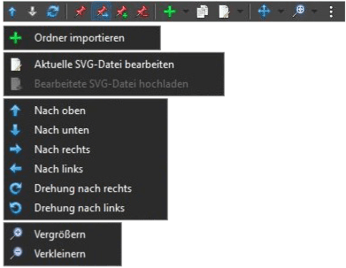 - Ordner importieren: Statt der Auswahl einer einzelnen SVG-Datei wird ein ganzer Ordner selektiert. Alle darin befindlichen SVG-Dateien werden einzeln importiert und mit der aktuellen Auswahl an Strukturelementen verknüpft.