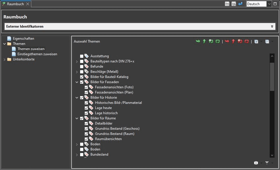 - Die Auswahl eines übergeordneten Kontextes filtert die Themenhierarchie nicht automatisch auf seine Unterkontexte, Sichtbarkeit von Elementen in Unterkontexten erfordert deren gesonderte Aktivierung.