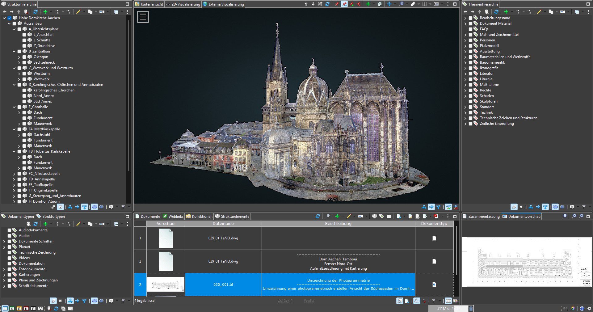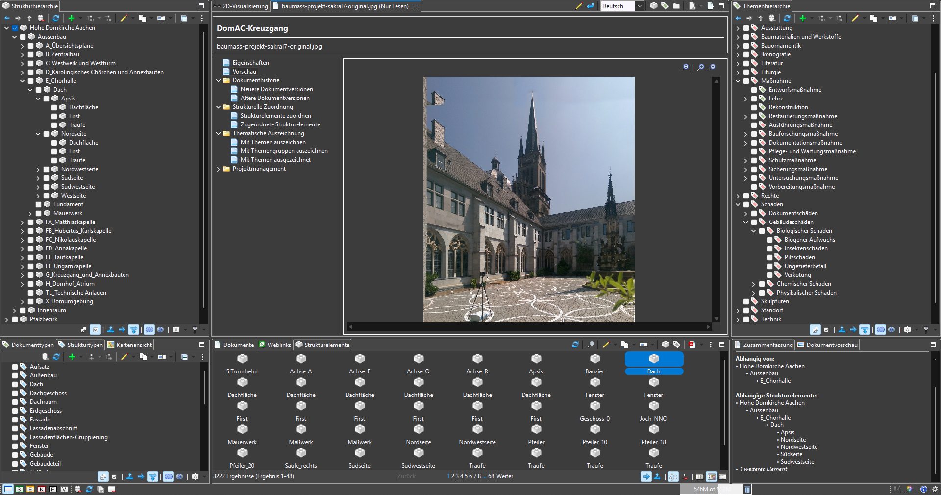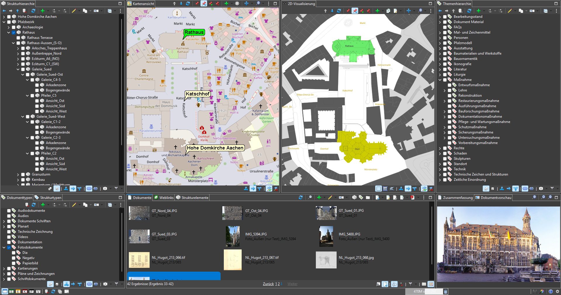 Durch MonArch können Informationen aller Art, wie historische Quellen und Pläne, Fotografien, Befunddokumentationen, Restaurierungsmaßnahmen sowie Materialkategorisierungen in einem einheitlichen System zentral zusammengeführt, vernetzt und nachhaltig archiviert werden. So wird das Wissen um Baugeschichte und Erhaltungszustand des Aachener Doms gesichert und auch für künftige Generationen der Dombauhütte nutzbar gemacht – als digitales Fundament für die Fortführung karolingischer Bau- und Forschungstradition.