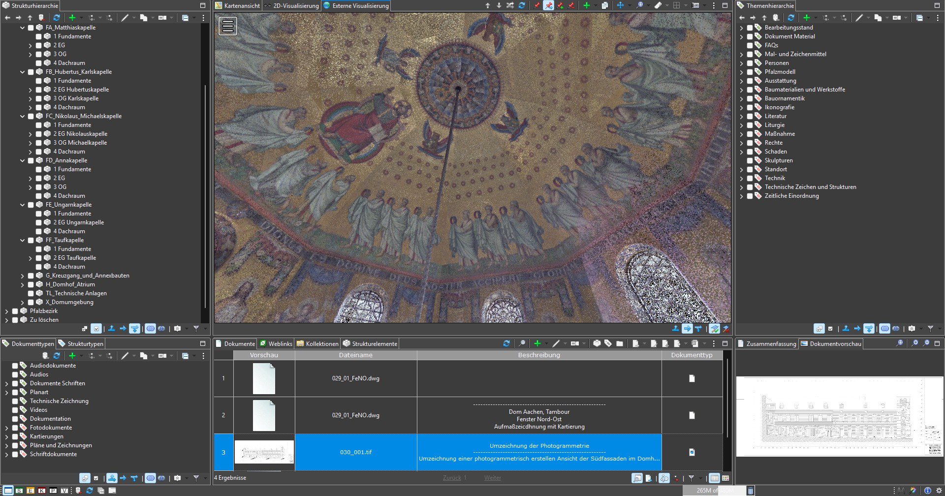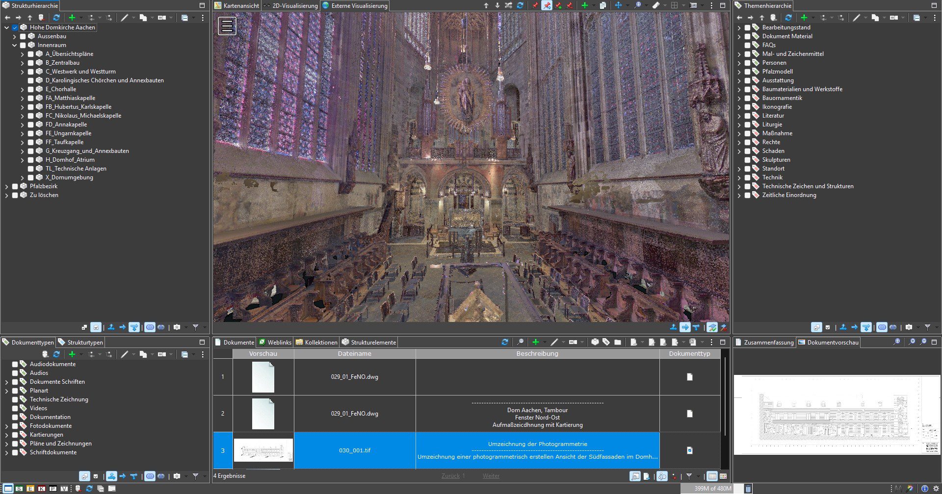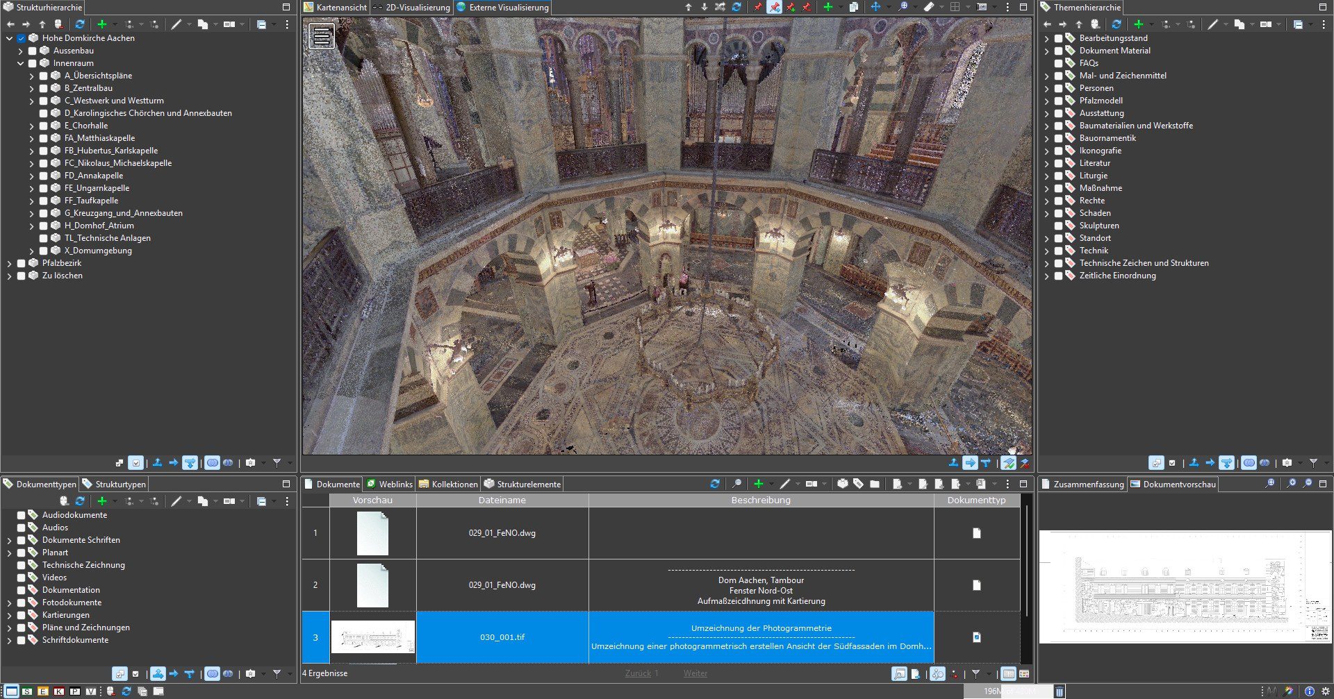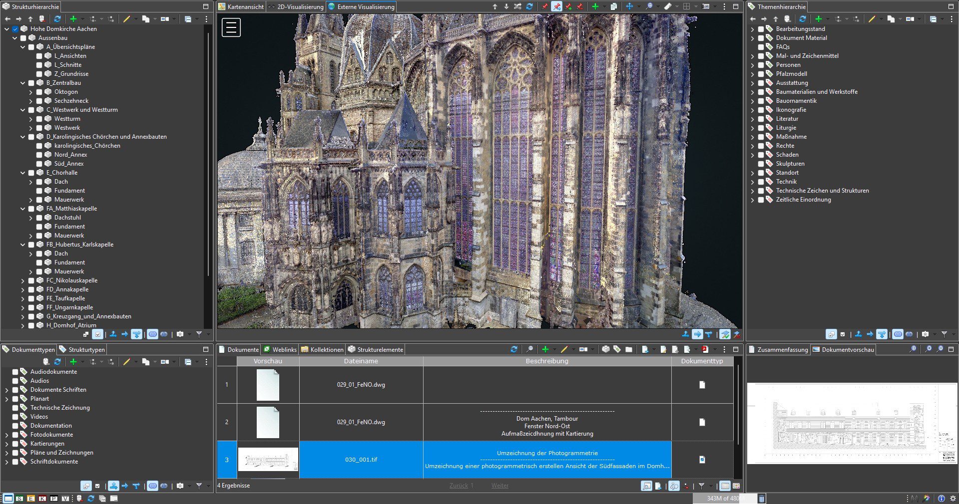 Durch MonArch können Informationen aller Art, wie historische Quellen und Pläne, Fotografien, Befunddokumentationen, Restaurierungsmaßnahmen sowie Materialkategorisierungen in einem einheitlichen System zentral zusammengeführt, vernetzt und nachhaltig archiviert werden. So wird das Wissen um Baugeschichte und Erhaltungszustand des Aachener Doms gesichert und auch für künftige Generationen der Dombauhütte nutzbar gemacht – als digitales Fundament für die Fortführung karolingischer Bau- und Forschungstradition.