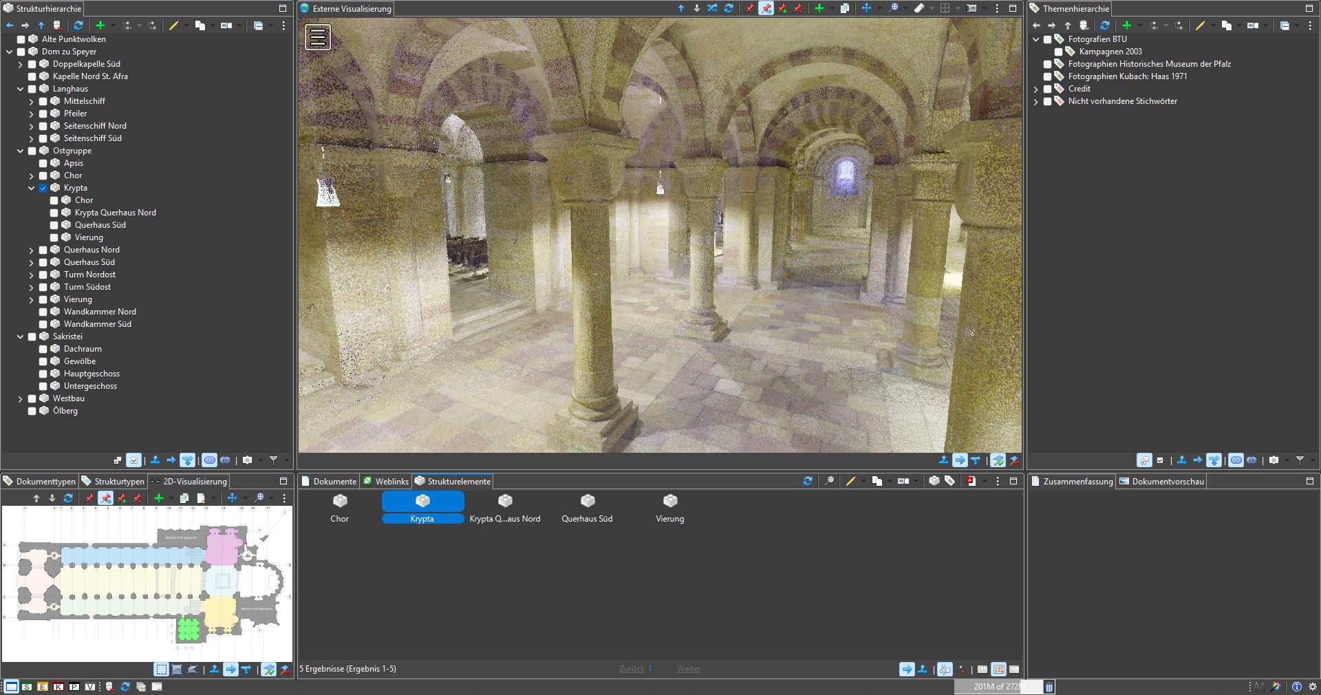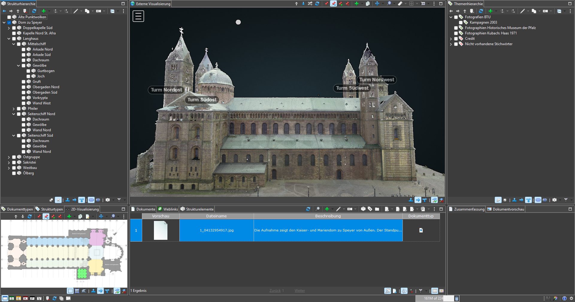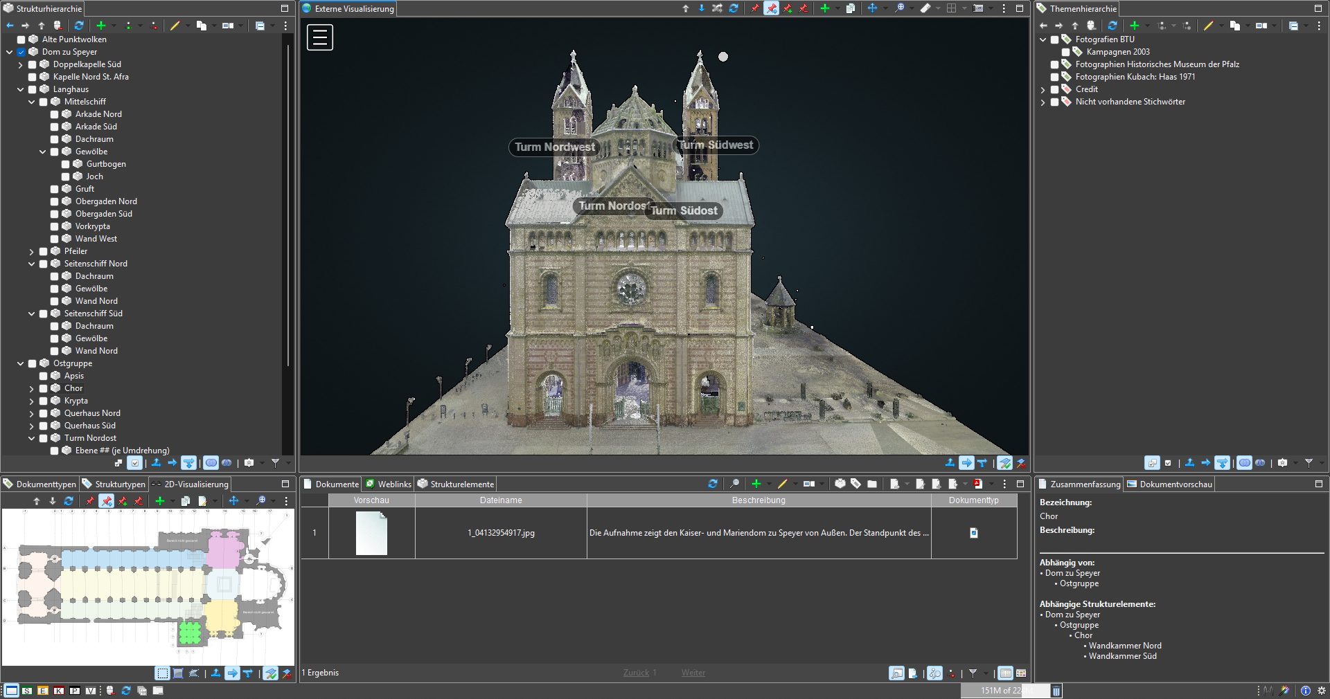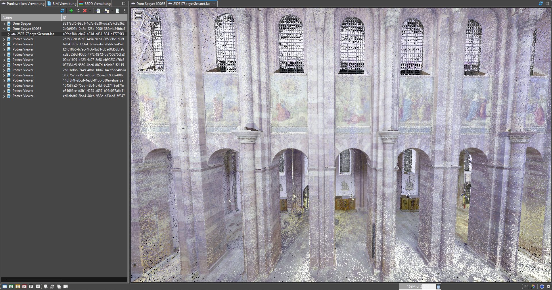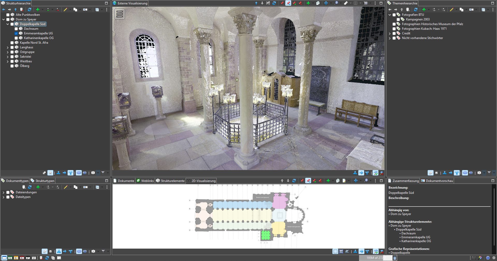 Die digitalen Daten zum Kaiserdom Speyer werden derzeit im Rahmen eines Kooperationsprojekts von der BTU Cottbus–Senftenberg erfasst, gepflegt und verwaltet. Der Datenbestand, auf den neben der Universität selbst auch das Dombauamt des Speyrer Doms Zugriff hat, dient als Grundlage für Forschung, Lehre und weiterführende digitale Projekte im Bereich der Denkmalpflege. Im Zuge dieser Arbeiten wurde auf dem MonArch-Punktwolkenserver unter anderem die bislang größte Punktwolke getestet – mit einem Datenvolumen von rund 600 GB. Dieser Test stellt einen wichtigen Schritt für die Skalierbarkeit und Leistungsfähigkeit der Plattform bei der Verarbeitung großvolumiger 3D-Daten historischer Bauwerke dar.