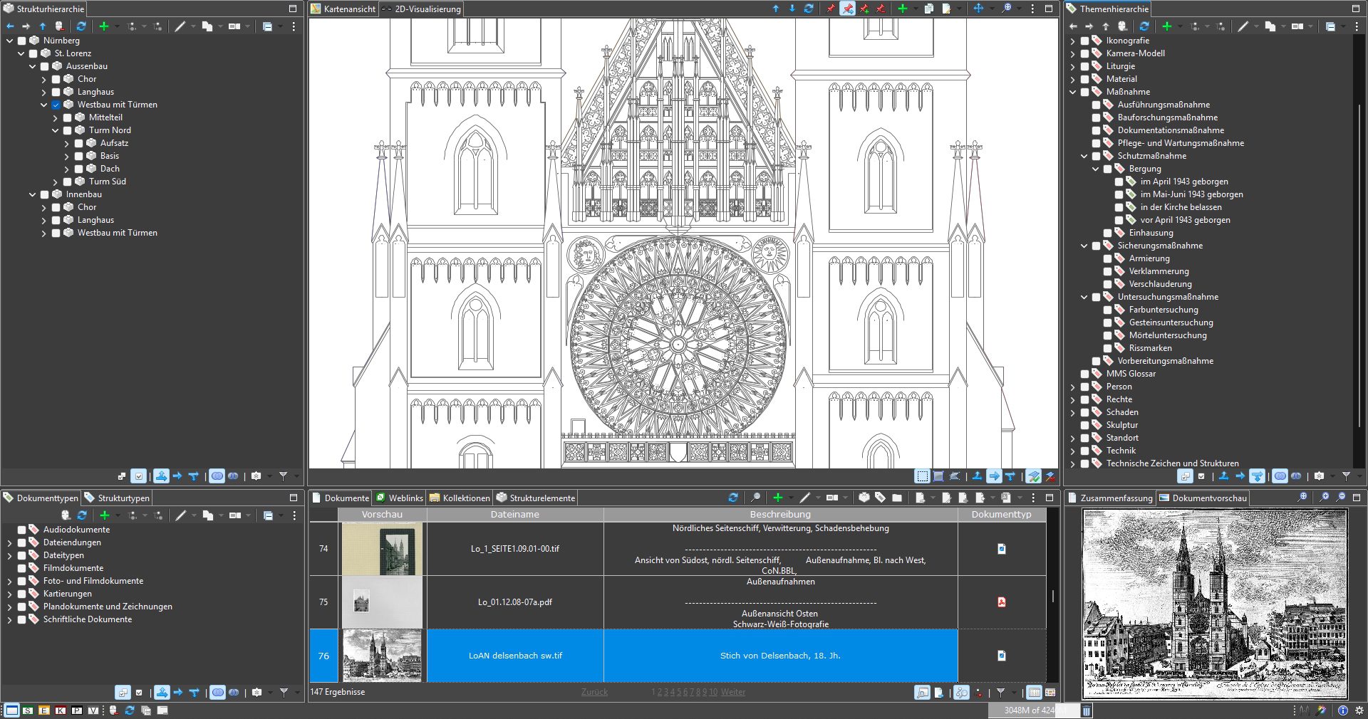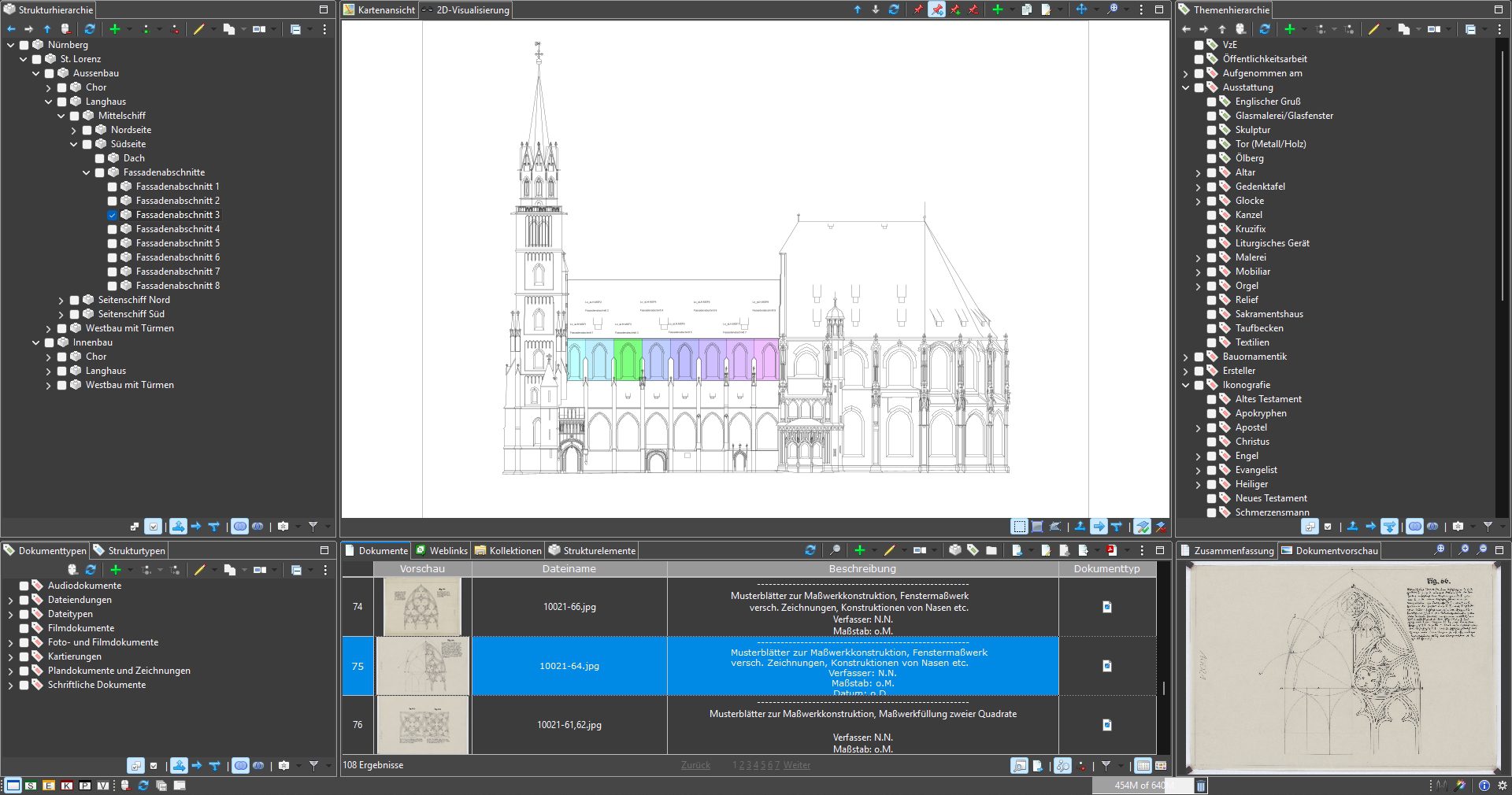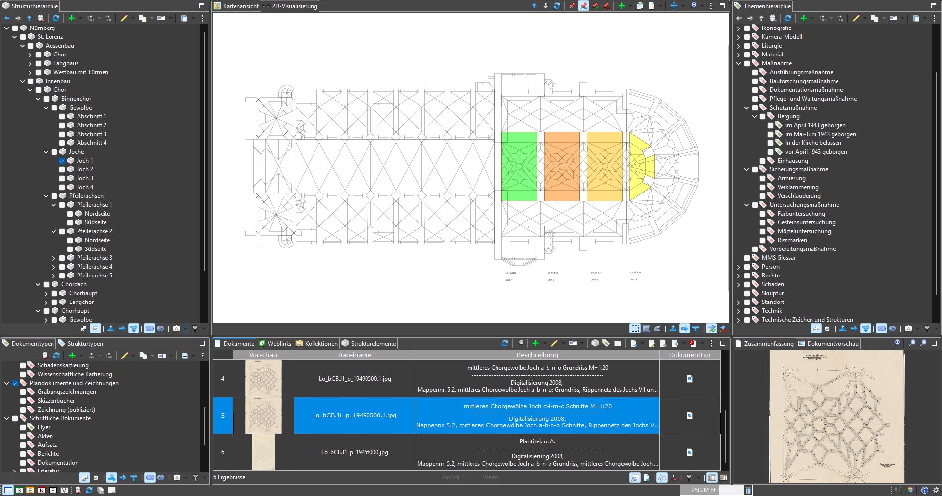 Ausgangspunkt der Arbeiten war die Digitalisierung und Katalogisierung der umfangreichen Archivbestände. Die so erschlossenen Informationen wurden in MonArch digital hinterlegt, um die historischen Materialien langfristig zu sichern und zugänglich zu machen. So konnten die empfindlichen Originaldokumente geschont und zugleich neue Grundlagen für restaurierungs- und baugeschichtliche Forschungen geschaffen werden. Die im MonArch-System gespeicherten Digitalisate wurden anschließend mit umfangreichen Metadaten versehen – einerseits durch ihre räumliche Verortung innerhalb der Bauwerksstruktur, andererseits durch ihre mehrdimensionale semantische Verschlagwortung. Zur Ergänzung der virtuellen Gebäudestruktur wurde ein umfangreicher Satz von Planzeichnungen zusammengeführt, aufbereitet und in einem offenen, plattformunabhängigen Vektorformat bereitgestellt. Diese Pläne wurden mit der Bauwerksstruktur verknüpft und zusätzlich mit kunstwissenschaftlichen, baugeschichtlichen und konservatorischen Befunden angereichert. Durch diese Integration entstand eine interaktive Dokumentation, die Forschung, Denkmalpflege und Site-Management gleichermaßen unterstützt.