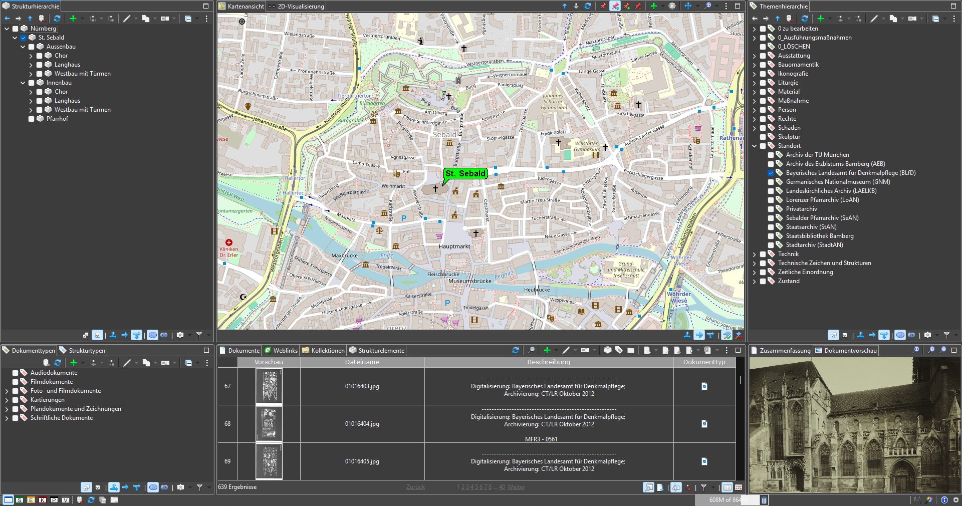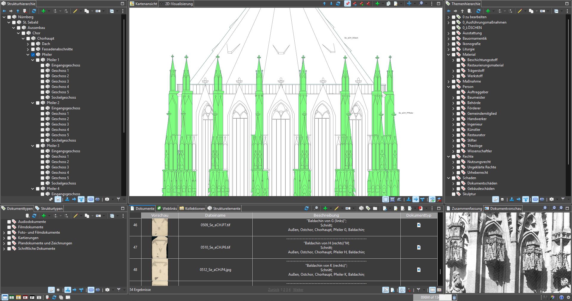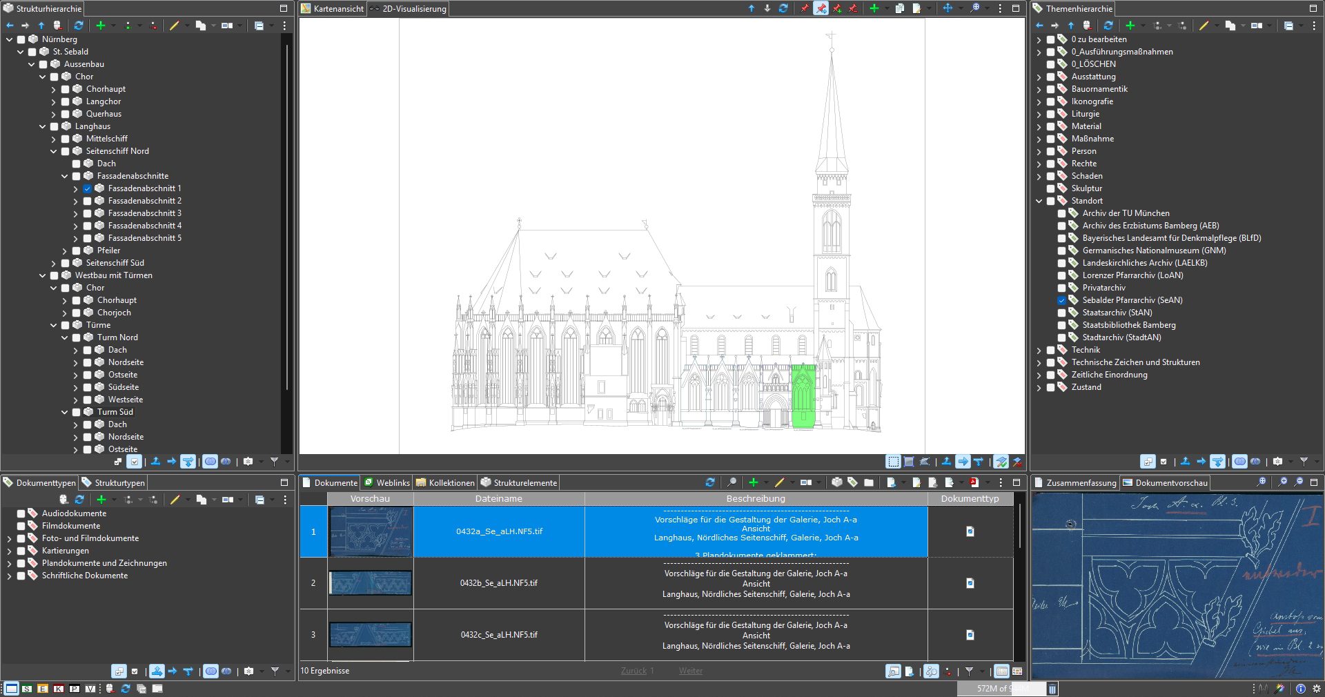 Ausgangspunkt der Arbeiten mit MonArch war die Inventarisierung und Bewertung der umfangreichen Archivbestände. Besonders hervorzuheben ist dabei der Planfund zur großen Restaurierung der Kirche Ende des 19. Jahrhunderts, der im Rahmen des Projekts erschlossen werden konnte. Die dabei gewonnenen Informationen wurden digital in MonArch erfasst, um die historischen Materialien langfristig zu sichern und gleichzeitig für Forschung und Denkmalpflege nutzbar zu machen. Anschließend wurden die im System gespeicherten Digitalisate sowohl räumlich innerhalb der Bauwerksstruktur der Sebalduskirche verortet als auch mehrdimensional semantisch verschlagwortet. Ergänzend entstand ein umfangreicher Satz zweidimensionaler Planunterlagen, der aufbereitet und mit der Bauwerksstruktur verknüpft wurde. Durch diese präzise und vernetzte Dokumentation lässt sich die Baugeschichte der Sebalduskirche heute detailliert nachvollziehen. Die digitale Erfassung in MonArch leistet damit einen wesentlichen Beitrag zur Erhaltung, Erforschung und Vermittlung dieses einzigartigen Kulturerbes.
